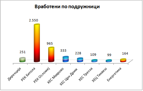 In AD ESM – Skopje, as of 2020, there are 4,699 full-time employees and 367 workers through the Agency for Temporary Employment. The number of employees is distributed in the Headquarter and in the branches: Branch HES Mavrovo Gostivar – 333 employees, branch HES Crn Drim Struga – 228 employees, branch HPP Tikves Kavadarci – 99 employees, branch HES Treska Skopje – 1o9 employees 50 Headquarter, Skopje – 251 employees.