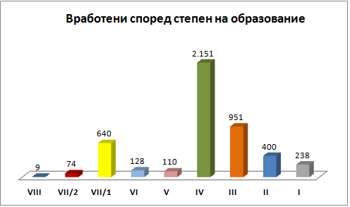 According to the level of professional training, most employees or 46% are with IV degree high school; 20% of the employees are with III degree high school in occupation; 14% have a VII / 1 degree or higher education; 9% are workers with II degree; 5% have I degree unskilled employees; 3% have a VI degree of higher education; 2% are with V degree highly skilled workers; 2% have VII / 2 degree masters and almost 0.2% of the employees in the company have VIII degree doctors of sciences.